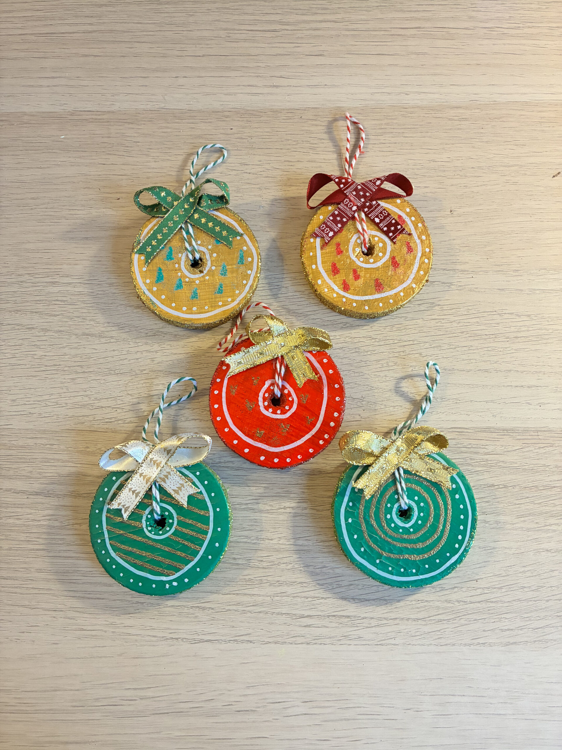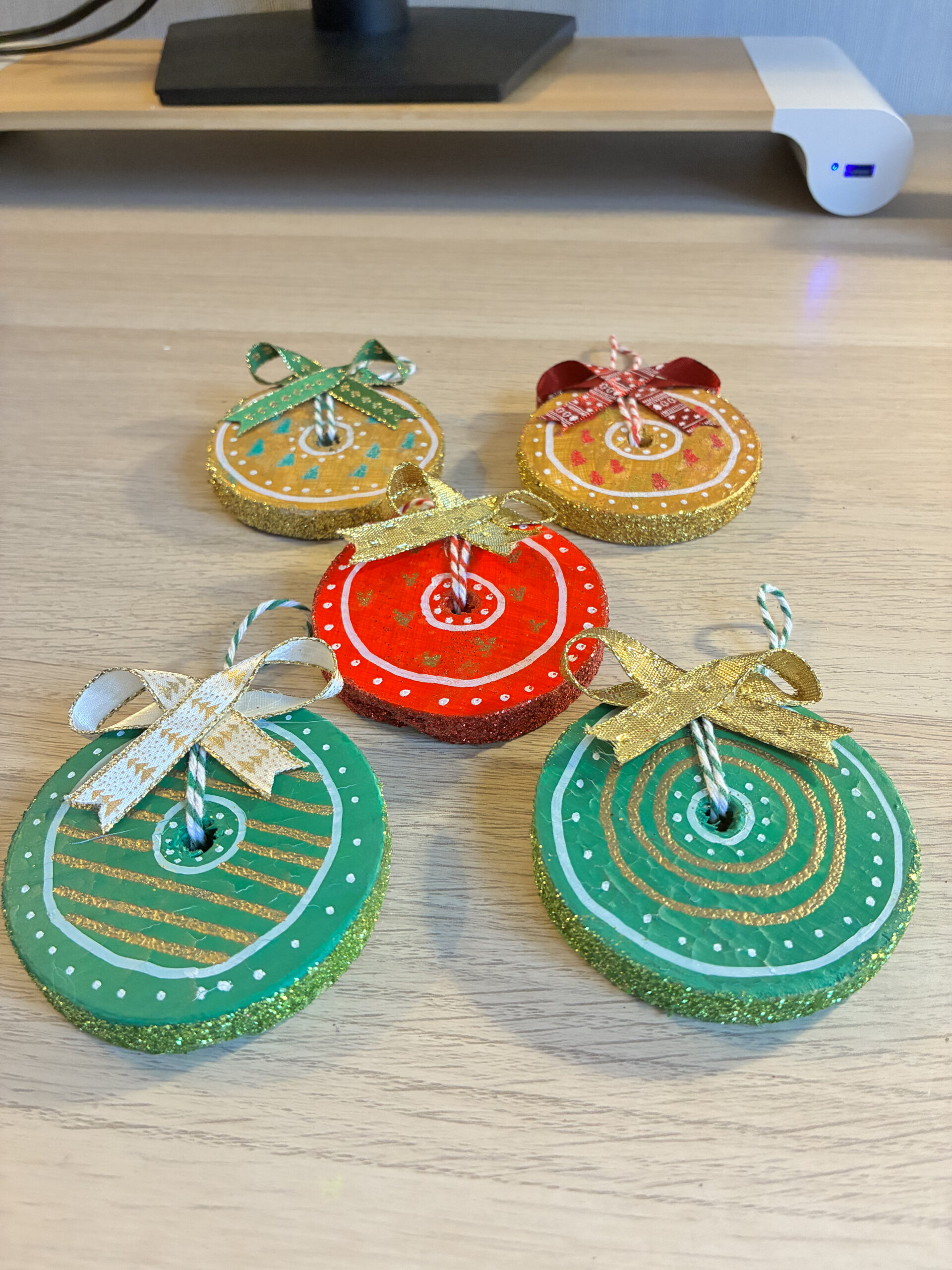 Lot de 5 décorations en bois faites à la main, peintes et paillettes sur la tranche