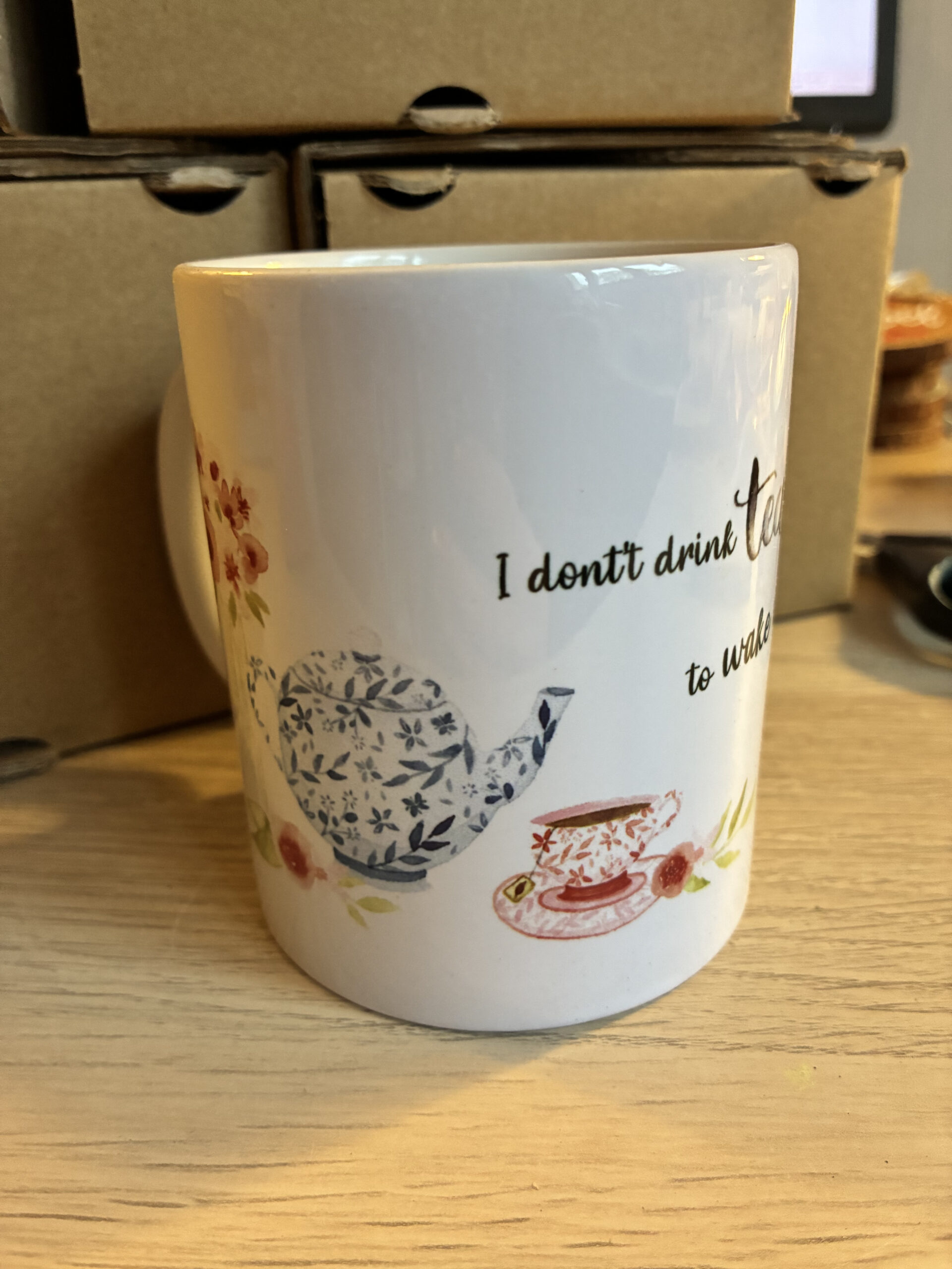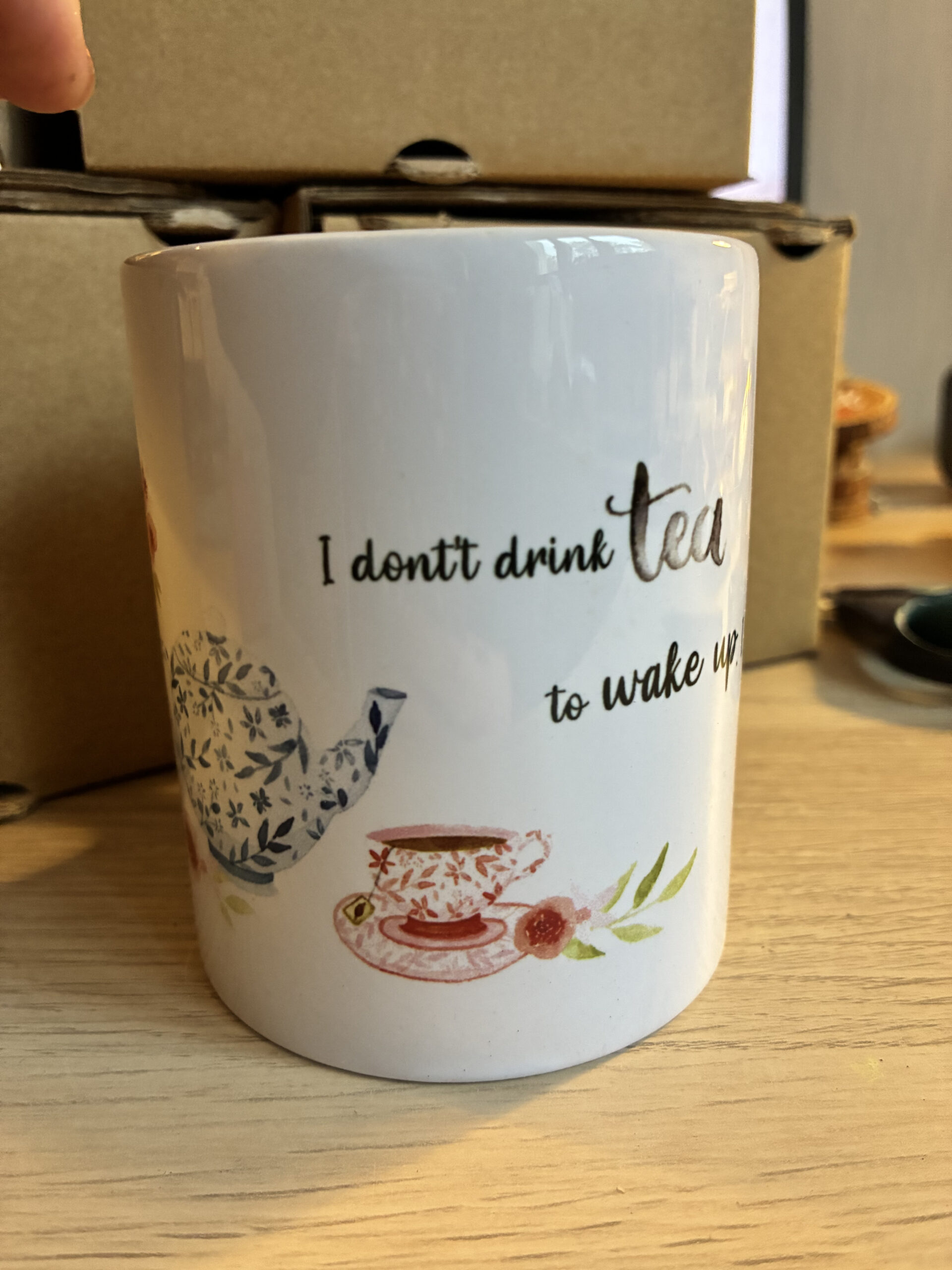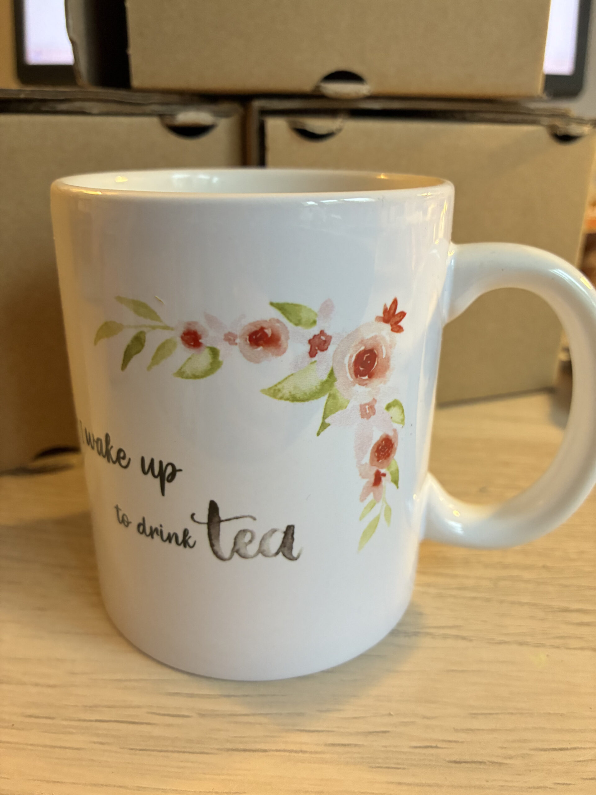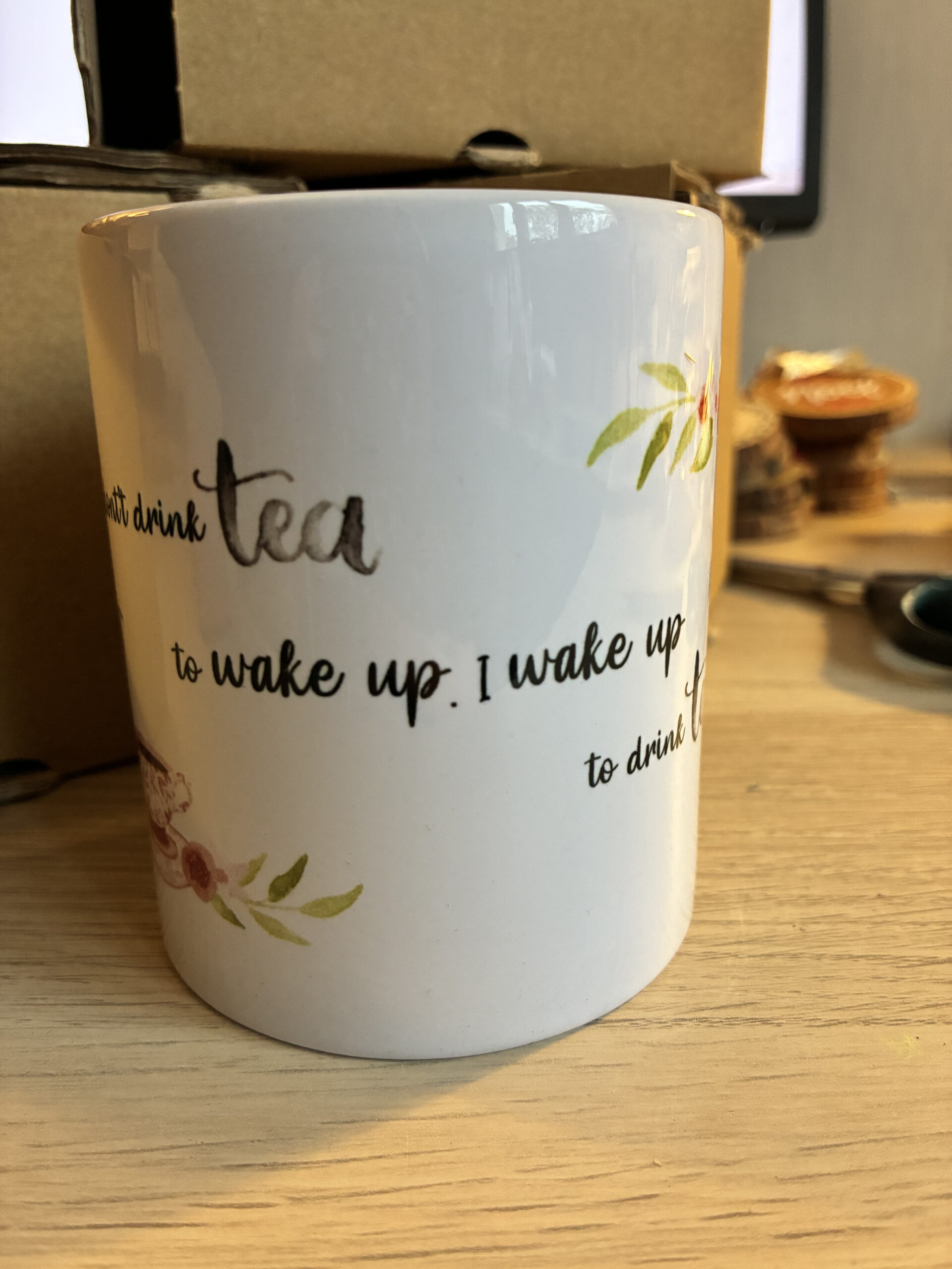 Mug avec illustration théière et fleurs à l’aquarelle et citation, peintes puis imprimées.